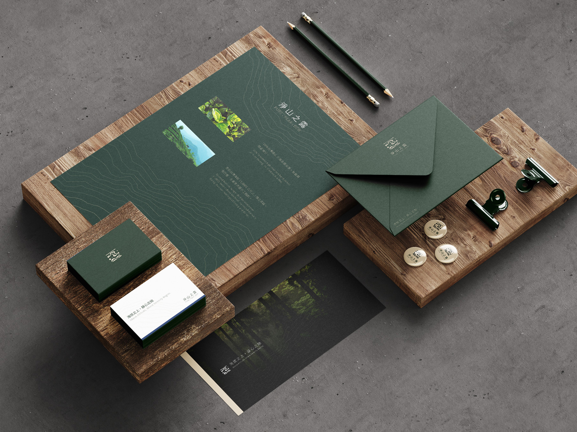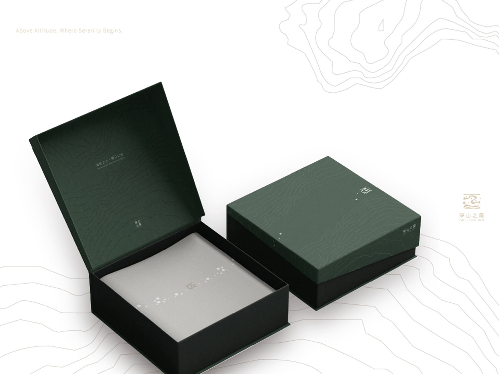 「淨山之露」以養成茶葉獨特風味的「山氣」為設計元素,含蓋了天、地、雲、雨的概念在其中。顏色採用了高山森林般深邃的綠與反射在水珠裡朝陽的金色光芒。為這沐浴在晨露中,生長在高山上的心血留下一抹純粹意象。