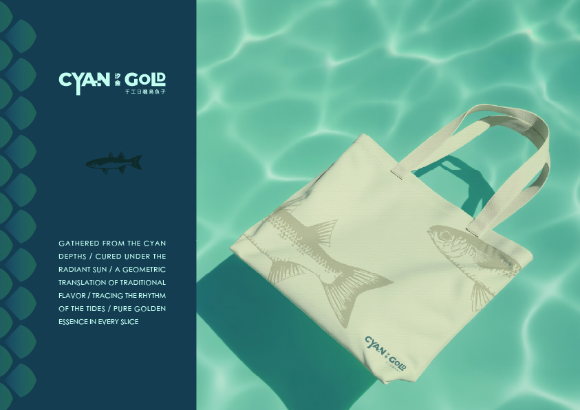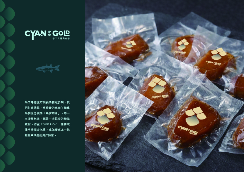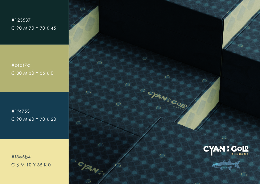以烏魚身上的一抹青色及「烏金」的諧音霧金做為標準色,以「汐金」的英文 (Cyan Gold) 為設計主軸,魚鱗與魚拓的設計加強了烏魚子、烏魚之間連繫就像與家人、家族緊密相連的血脈一般。傳達一抹輕盈且深邃的海洋詩意。